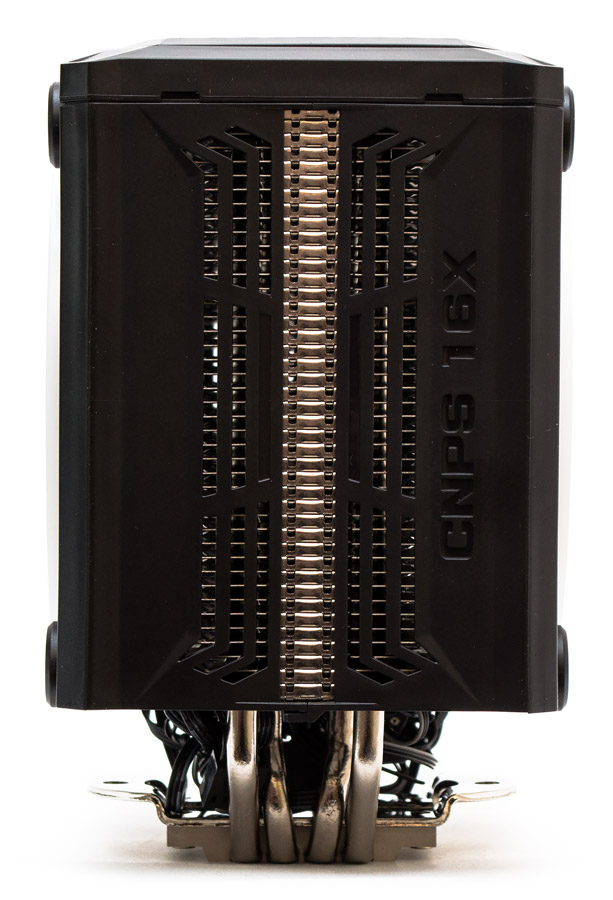 Без внешнего обвеса Zalman CNPS16X представляет собой классический радиатор с U-образным расположением тепловых трубок весом в 490 грамм. Тепловые трубки никелированы, а ребра анодированы, для придания им темного цвета и защиты от коррозии.