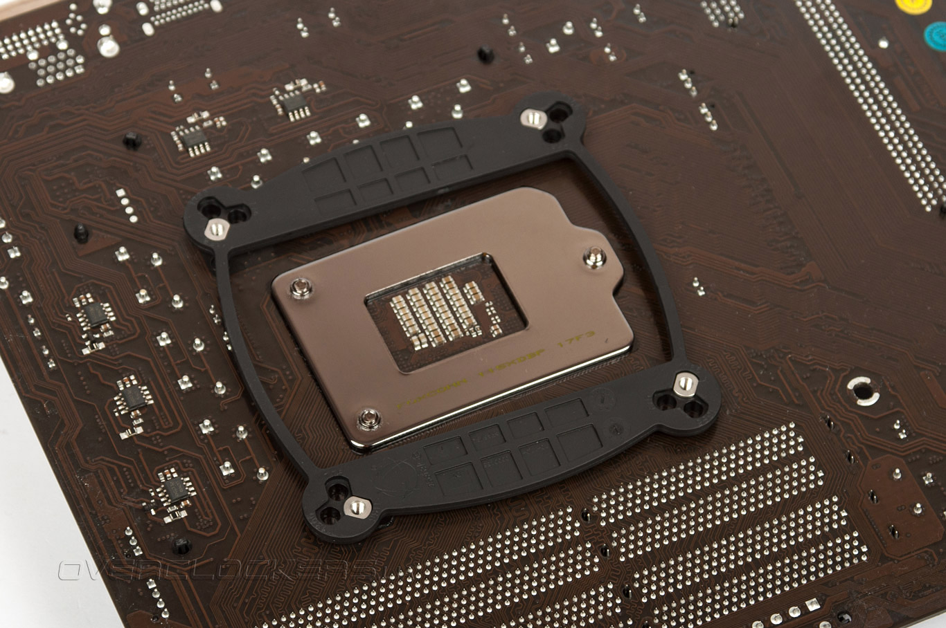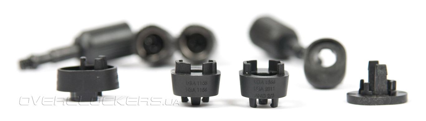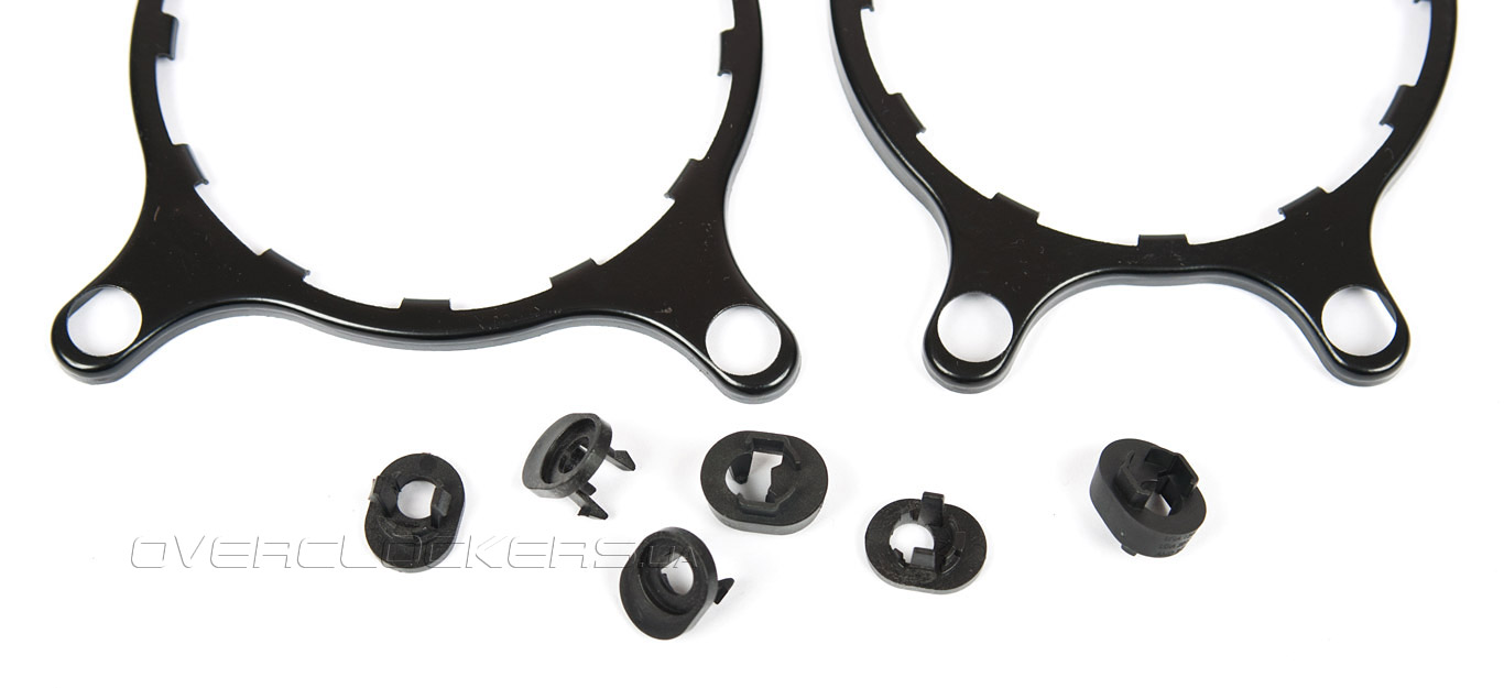 Они состоят из двух частей: меньший элемент должен находиться сверху прижимной пластины, больший — снизу. Небольшое усилие — и пластиковые элементы защелкиваются с двух сторон рамки. Обратите внимание на расположение отверстий: для разъемов LGA1366 и LGA2011 оно должно быть с самого краю.
