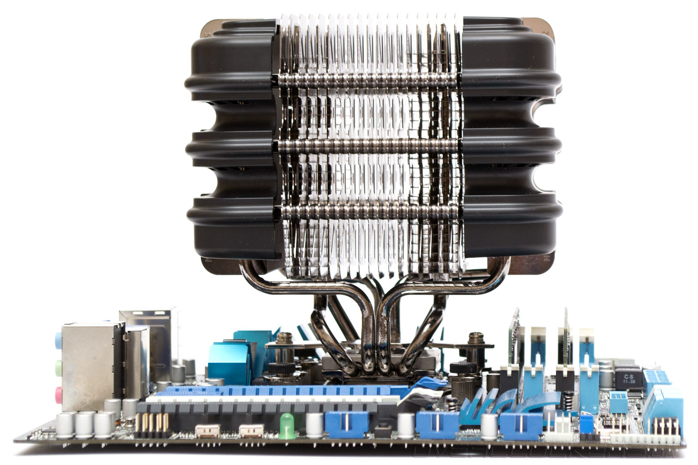 Хотя процессорный разъем находится слишком близко к памяти и единственному слоту PCI-E, оказалось, что поигравшись с ориентацией радиатора, на плату можно установить большинство кулеров. Но крупные радиаторы, в любом случае, закроют разъем для видеоадаптера. Аутсайдером по совместимости традиционно стал Zalman CNPS14X. Экзотический конфликт возник и у Zalman CNPS8000B — в одном из положений его тепловые трубки не давали возможности подключить питание процессорного вентилятора.