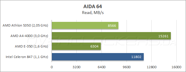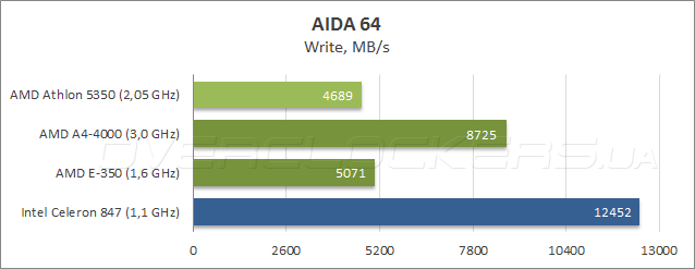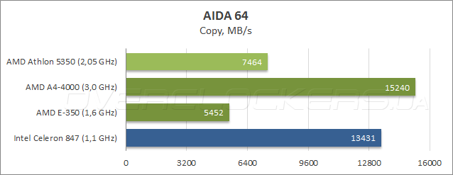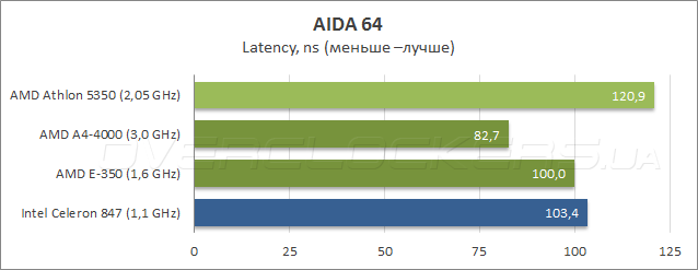 Лучшие показатели пропускной способности ОЗУ ожидаемо показали AMD A4-4000 и Celeron 847, которые поддерживают двухканальный режим доступа. Результаты новичка низкие, причем, в подтесте записи и по уровню латентности Athlon 5350 уступил даже E-350.
