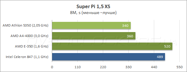 Скорость вычисления числа Пи с точностью до 8 млн. знаков после запятой в программе Super Pi отражает производительность при выполнении однопоточных вычислений. В данной дисциплине Athlon 5350 опередил всех соперников, даже А4-4000, который обладает существенным преимуществом в частоте.