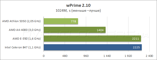 В многопоточном тесте wPrime новый APU Kabini одержал убедительную победу. Все-таки, четыре полноценных ядра работают куда лучше, чем двухъядерный вычислительный модуль Piledriver, которым оснащен А4-4000. Что касается Celeron 847 и AMD E-350, то на выполнение задания они затратили почти втрое больше времени, чем лидер.