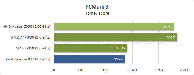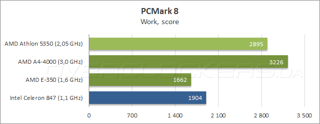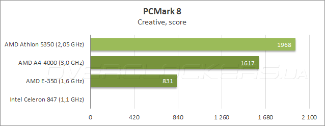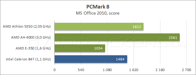 Оценка уровня быстродействия в повседневных прикладных задачах, измеренная с помощью Futuremark PCMark 8, показала, что Athlon 5350 на равных конкурирует с младшим APU Richland в подтестах Home и Work, а в сценарии Creative, который даже не запустился на Celeron 847 из-за отсутствия поддержки DX11, существенно опередил своего собрата. Что касается тестовой трассы, моделирующей работу в офисном пакете MS Office 2010, то здесь важна тактовая частота, поэтому, новичок проиграл А4-4000. Оставшиеся два участника показали очень невысокое быстродействие.