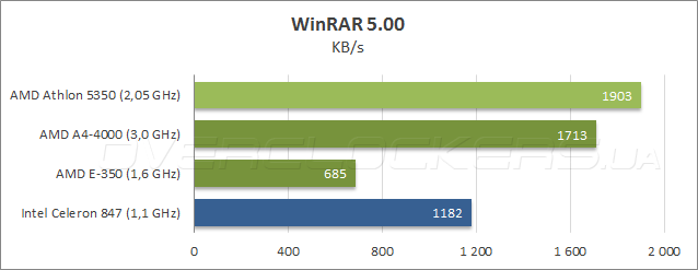 Измерение скорости архивации в программе WinRAR 5.00 показало уверенное преимущество Athlon 5350. Способность эффективно исполнять четыре вычислительных потока оказалась важнее пропускной способности ОЗУ, хотя, имей Kabini двухканальный контроллер памяти — результаты могли бы быть еще лучше. Несмотря на преимущество в тактовой частоте AMD A4-4000 заметно отстал, а два оставшихся участника не смогли похвастаться высоким быстродействием.