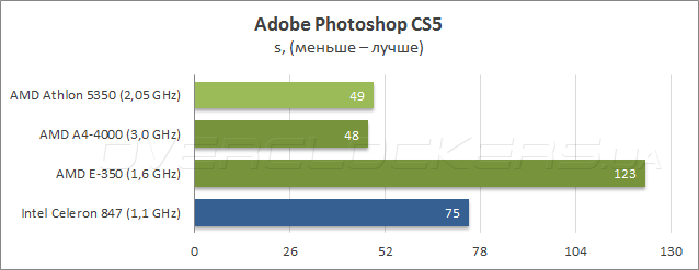 С помощью скрипта Retouch Artist Benchmark, запущенного в программе Adobe Photoshop CS5 была проведена оценка быстродействия обработки цифровой фотографии. Первое место разделили APU Kabini и младший Richland, показавшие очень близкие результаты, тогда как обоим энергоэффективным процессорам потребовалось намного больше времени для выполнения задания.