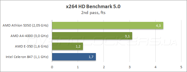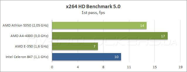 Не исключено, что неттоп будет использоваться для кодирования видео Full HD, например, для загрузки видеоролика на мобильный телефон, поэтому, было проведено тестирование в x264 HD Benchmark v5.0. Как и следовало ожидать, экономичные процессоры подходят для этой задачи не лучшим образом, особенно это касается Celeron 847 и AMD E-350. Основная борьба завязалась между Athlon 5350 и A4-4000: новичок оказался чуть быстрее при выполнении второго прохода кодирования, а его соперник показал лучшие результаты во время первого прохода.