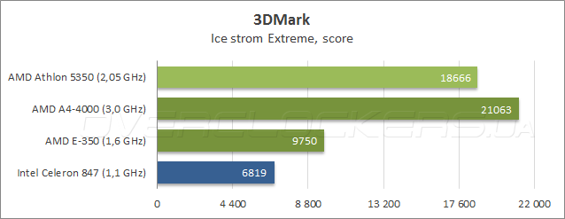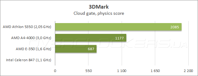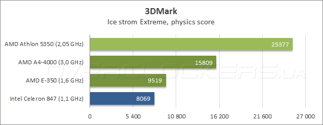 В тестовом сценарии Ice storm с настройками Extreme наилучшие результаты показал AMD А4-4000, но герой сегодняшнего обзора отстал от него совсем незначительно. Детальный анализ дает понять, что победа младшему Richland досталась за счет более высокого быстродействия графической подсистемы, тогда как при расчете игровой физики Athlon 5350 продемонстрировал убедительное преимущество. Результаты оставшихся двух участников иначе как провальными не назовешь…