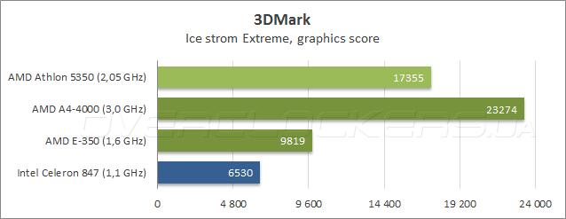 С учетом невысокой производительности экономичных процессоров в Futuremark 3DMark для тестирования в 3D-играх пришлось отказаться от использования современных проектов, в которых добиться приемлемого fps вряд ли получится. По той же причине тесты проводились в разрешении 1280х800 при низких или средних настройках качества изображения.