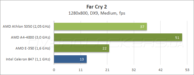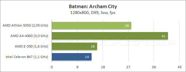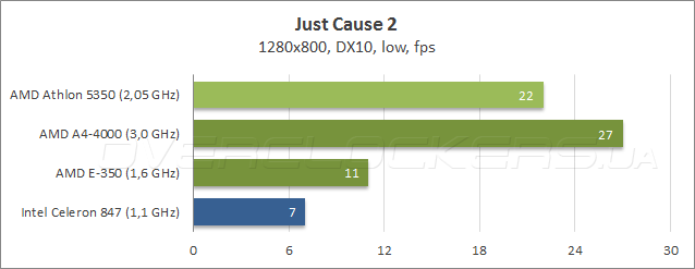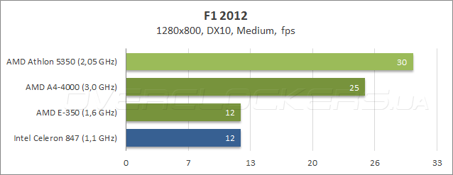 В играх Batman: Arkham City, Far Cry 2 и F1 2012 на Athlon 5350 можно получить приемлемую частоту смены кадров, тогда как в шутере от третьего лица Just Cause 2 быстродействие падает ниже 24 fps. Интересно выглядят результаты в гоночном симуляторе, где AMD А4-4000 явно не доставало вычислительной мощи, а новичку — пропускной способности ОЗУ. Что же до результатов Celeron 847 и AMD E-350, то следует признать: для игр они практически не годятся.