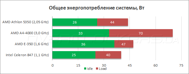 Система на базе APU Kabini оказалось одной из самых экономичных, как при простое, так и в нагрузке, уступив лишь несколько ватт конфигурации на базе мобильного процессора Celeron 847. Чуть более прожорливой оказалась платформа, оснащенная на AMD E-350, ну а самое большое энергопотребление показал гибридный процессор A4-4000, что, впрочем, не удивительно, учитывая его TDP, в 2,5–3 раза превышающий тепловые пакеты остальных участников тестирования. Но даже это не сделало его лидером в тестах быстродействия.