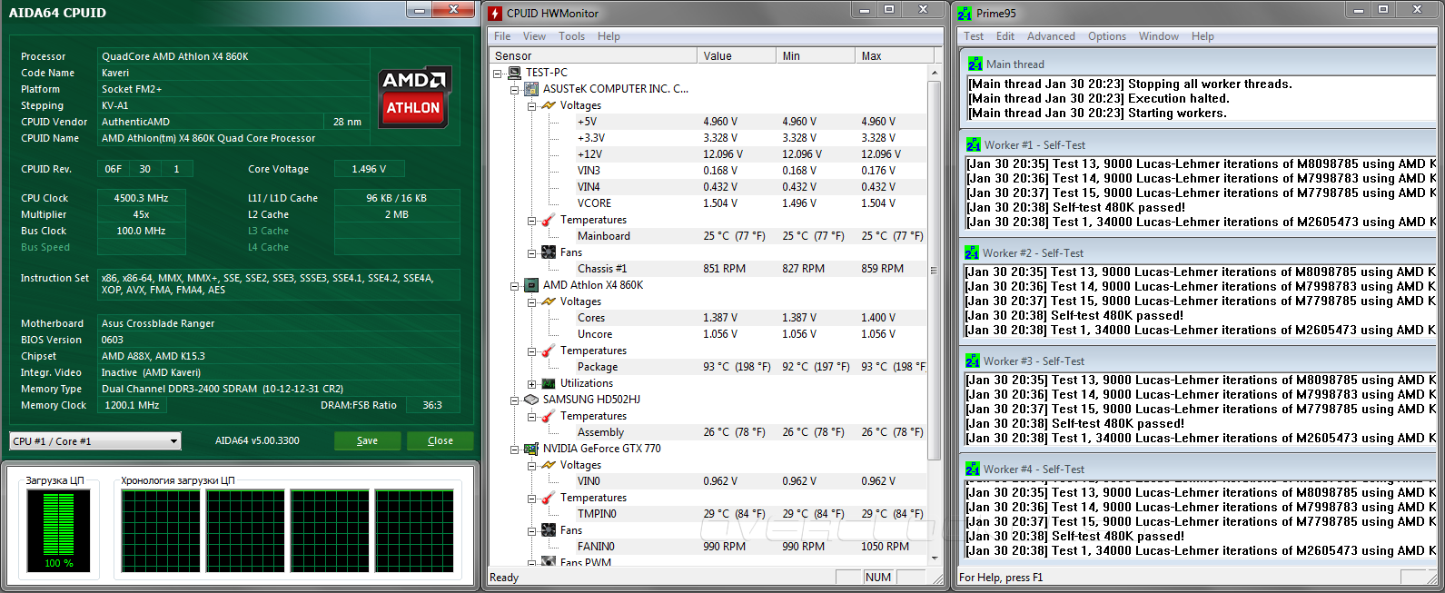 Несмотря на использование эффективного воздушного кулера нагрев процессора в разгоне достигал 93 °С, что может свидетельствовать о низкой эффективности термоинтерфейса между полупроводниковым кристаллом и металлической крышкой теплораспределителя. Эффективность от оверклокинга нам еще предстоит оценить во время практической части сегодняшнего обзора, а сейчас предлагаю ознакомиться с соперниками, с которым предстоит сразиться с AMD Athlon X4 860K в тестах быстродействия. С одним из них — Intel Pentium G3258 наши постоянные читатели хорошо знакомы, тогда как третий участник тестирования — AMD Athlon X4 760K ранее не фигурировал на страницах нашего ресурса, следовательно, заслуживает отдельного разговора.