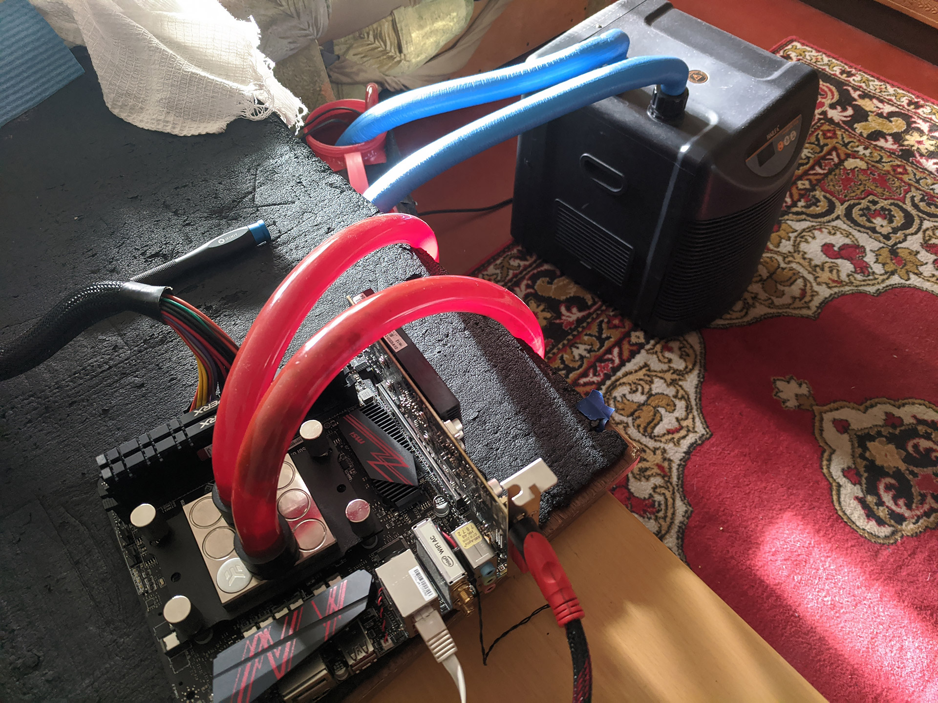 Контур СВО состоял из чиллера HAILEA HC-300A, бака для жидкости на 15 л, двух помп Hydor Seltz 1200 и водоблока CPU EK-Supremacy full Nickel.