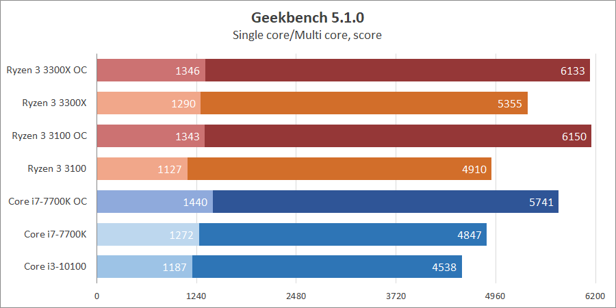 В Geekbench 5 на стандартных настройках Core i7-7700k, хоть и сильнее на одно ядро, идет на схожем с Ryzen 3 3100 уровне. С учетом разгона — новые Ryzen впереди, лучший контроллер памяти дает о себе знать.