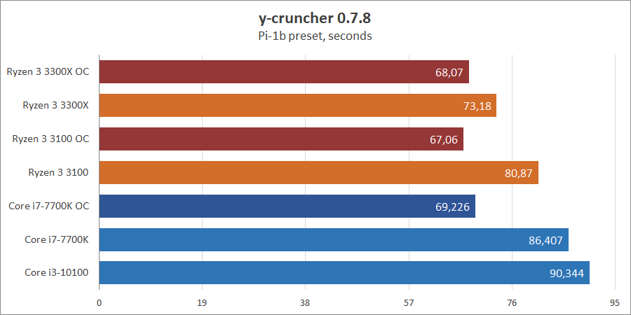 y-cruncher демонстрирует лесенку прогрессии по результатам, снова-таки новинки AMD обходят оппонентов, хотя с учетом разгона все испытуемые сравниваются.