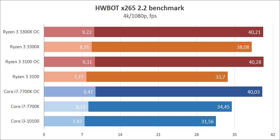 В x265 Ryzen 3 3300X превосходит всех, а младшая модель примерно на одном уровне с Core i7-7700K, но с учетом разгона последний лучше всего справляется с задачей 4k, а вот в 1080p новые процессоры AMD.