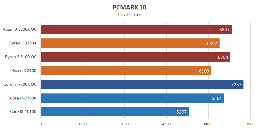 В комплексном PCMark10 Core i7-7700K впереди всех при любых раскладах, в свою очередь, Сore i3-10100 уступил почти 15% ближайшему сопернику.