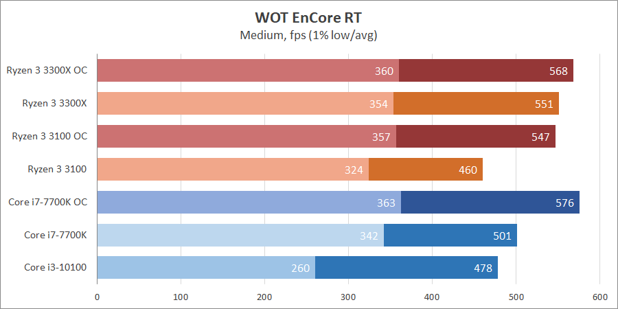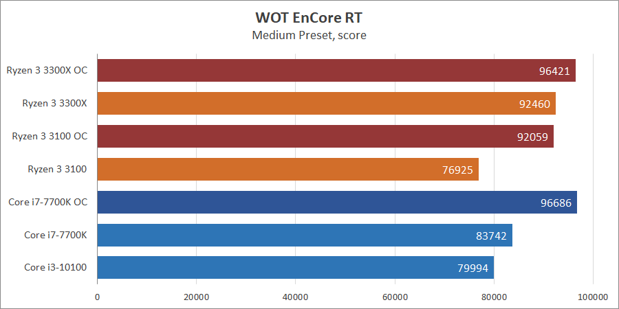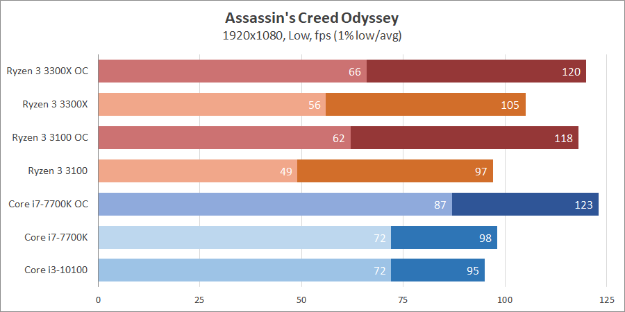Несмотря на значительные просадки 1% low Core i3-10100 получил финальный результат лучше, нежели Ryzen 3 3100, хотя превосходство по среднему fps минимально. Что касается Core i7-7700k — он находится посередине по умолчанию, с учетом разгона он, конечно же, лидер.