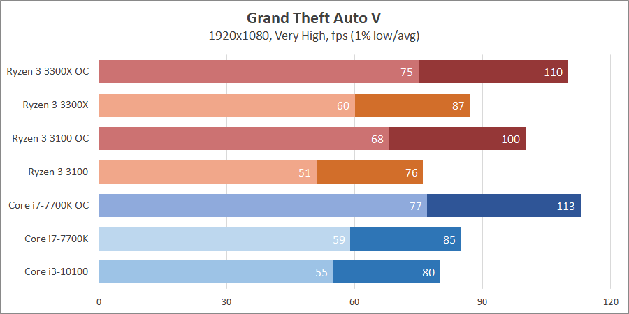 В GTA V старший процессор AMD на пару кадров обходит конкурента, тогда как Ryzen 3 3100 чуть слабее Core i3-10100. Разгон позволяет обогнать соперников в номинале.