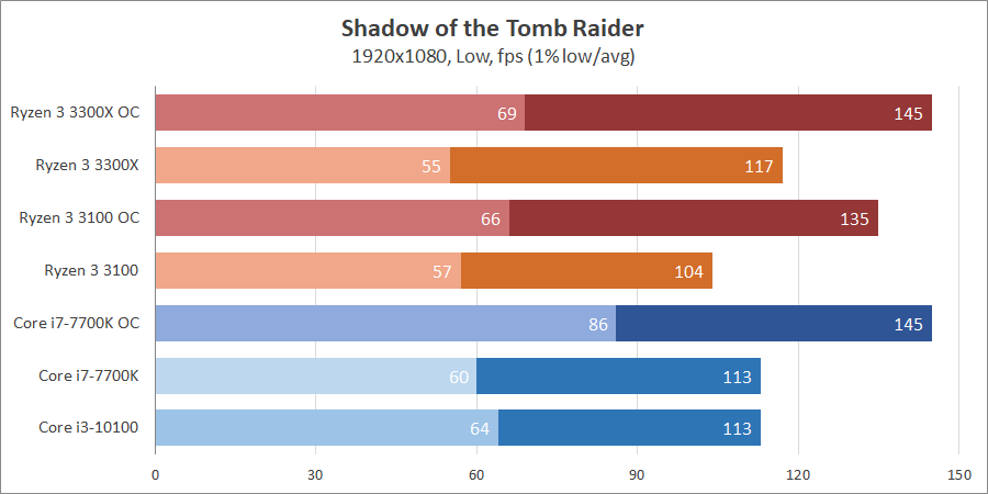 В игре Shadow of the Tomb Raider в среднем fps процессоры Intel из коробки превосходят Ryzen 3 3100, и почти равны Ryzen 3 3300X. В разгоне лидеры сравниваются, однако у Core i7-7700K недосягаемое преимущество в 1% low.