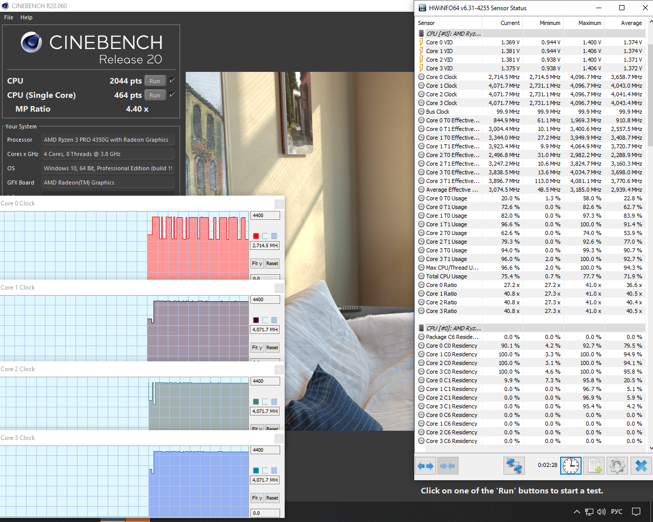 При запуске Cinebench R20 в режиме Single Core частота одного ядра Ryzen 3 держится выше максимального boost на величину около 100 МГц, что является следствием работы Extended Frequency Range (XFR) и Precision Boost. По мере увеличения количества активных потоков вплоть до семи — частота не снижается! Напряжение около 1,35 В с редкими пиками до 1,4 В. При загрузке всех потоков рабочая частота, в нашем случае 4096 МГц, под конец теста снизилась до 4071 МГц для всех ядер. Температуры не превышают 65 градусов со «штатным» охлаждением. Как видим, рабочие частоты из спецификаций современных процессоров — вещь весьма условная, и базовую частоту мы так и не обнаружили. Забавно с этими AMD — то буста нет, то бустит выше заявленного.