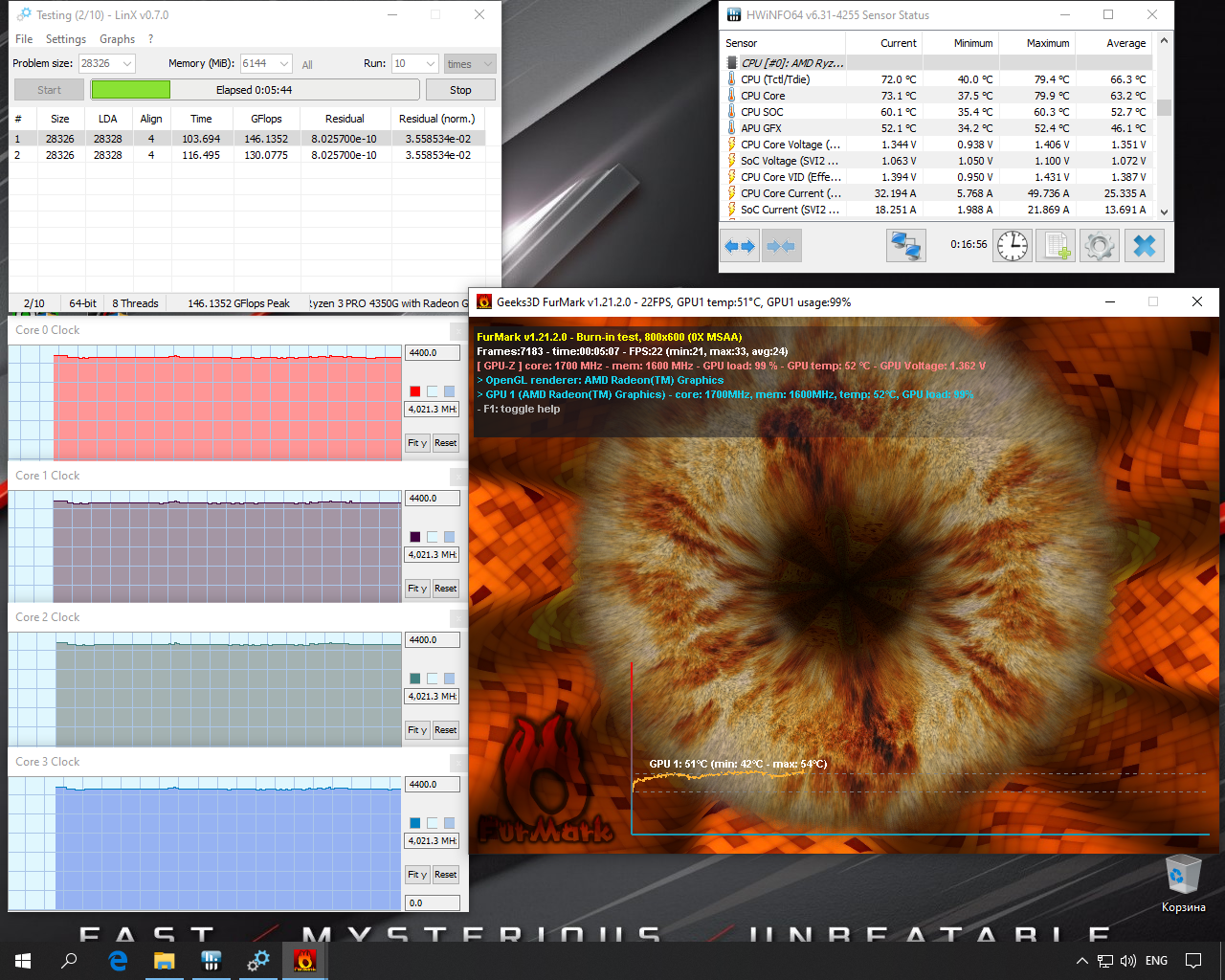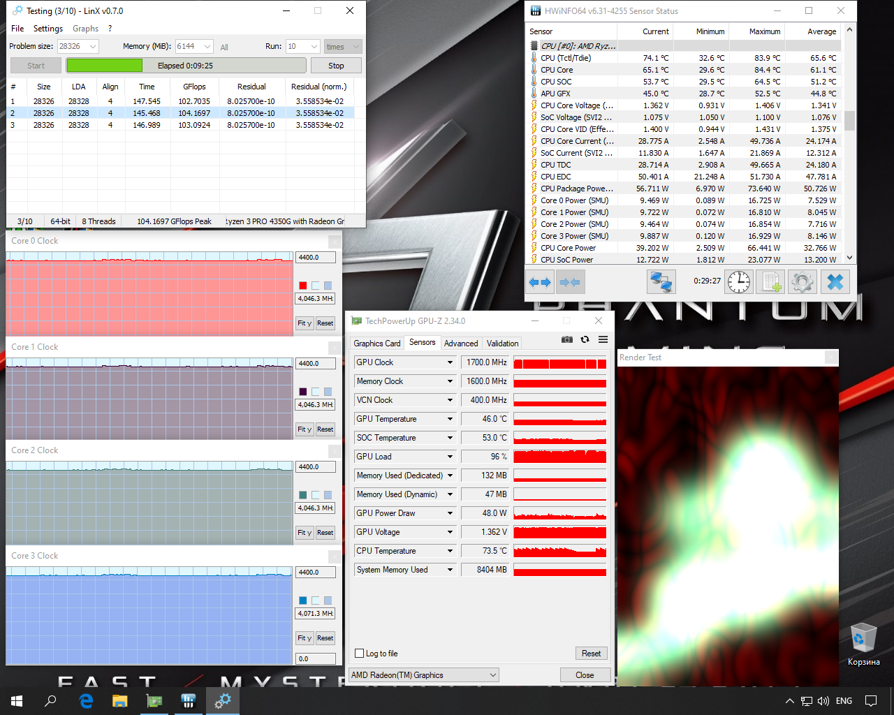 Ryzen 3 PRO 4350G при активации графического теста утилиты GPU-Z практически не снижает частоты ядер, прогрев стресс-тестом FurMark, доводит частоты вычислительных ядер до уровня 4025 МГц. Справедливости ради стоит отметить, серьёзное снижение количества получаемых GFlops в тесте Linx запущенном параллельно. Общий температурный режим сохранился на прежнем уровне. Частота встроенного графического адаптера показала завидную стабильность, держась у отметки 1700 МГц.