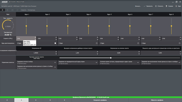 Разгон ЦП можно проводить не одним способом, однако для быстрого поиска частотных пределов вполне подойдёт фирменное ПО от AMD, названное Ryzen Master. На мой взгляд, уместным будет начать испытания с частоты 3700 МГц и напряжения 1,4 В. Для части пользователей даже такой уровень может казаться избыточным, тут каждый вправе сам принять решение, но сегодня, не прибегая к компромиссам, мы будем заниматься предельным разгоном (для воздушного типа охлаждения).