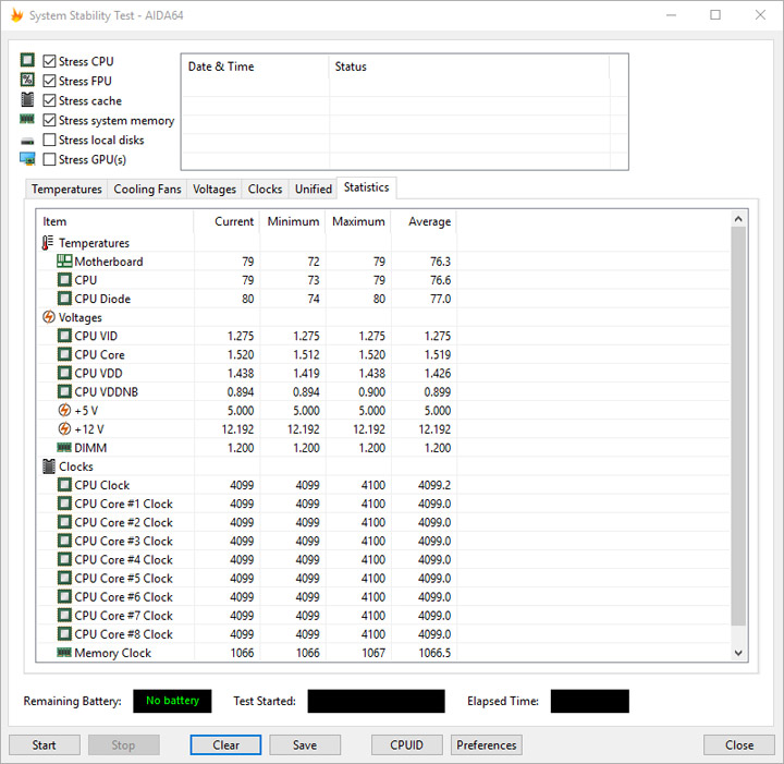 Непродолжительные испытания позволили мне снизить уровень до выставляемых в UEFI 1,4875 В, на CPU фиксируемой отметкой были 1,438 В. О перегреве ЦП даже с недорогим кулером пока речь не идёт, ведь температура не превысила и 80 градусов.