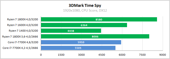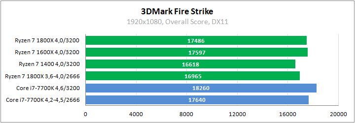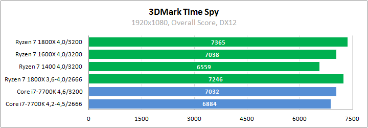 В более новом 3DMark Time Spy процессор AMD изначально в лидерах. С ним итоговый общий балл на 5% выше показателей конкурента. Разгон придает дополнительное небольшое ускорение. Конфигурация с 6 ядрами при 4 ГГц оказывается на уровне форсированного Core i7-7700K до 4,6 ГГц. Теоретический Ryzen 5 1400 слабее всех, но отставание от представителя Intel небольшое.