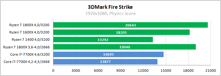 Тест Fire Strike из тестового пакета 3DMark прогонялся в разрешении 1920x1080. На итоговых диаграммах указаны данные по общему баллу на разных системах и данные теста физики (Physics).