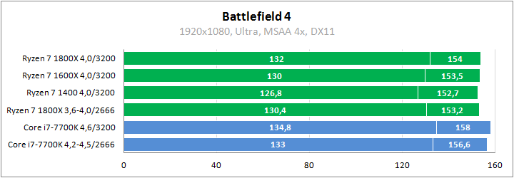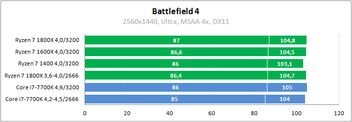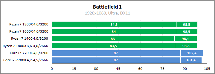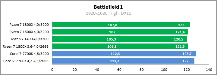 В Battlefield 1 ситуация отличается незначительно. Общая производительность даже при высоком качестве графики ниже, преимущество Core i7-7700K над Ryzen 7 1800X около 4%. Разгон дает минимальный рост быстродействия. Ryzen с 4 ядрами при частоте 4 ГГц чуть слабее товарищей, но это тоже едва заметная величина.