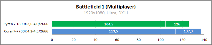 При стандартном профиле Ultra-настроек разница между процессорами хороша видна. AMD Ryzen 7 1800X снова уступает сопернику, хотя общая частота кадров далеко за 120 fps.