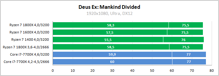 Игра Mankind Divided известна жесткими требованиями к графическим ускорителям. Но и мощный процессор обеспечивает явные преимущества. При очень высоких настройках весьма хорошее преимущество у Intel Core i7-7700K.