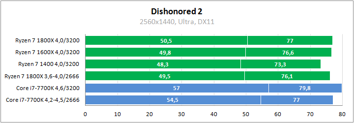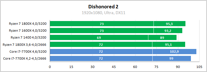 Перед рассмотрением результатов тестирования в Dishonored 2 отметим, что минимальный fps тут может заметно скакать. Так что при оценке этого параметра надо учитывать фактор возможной погрешности.