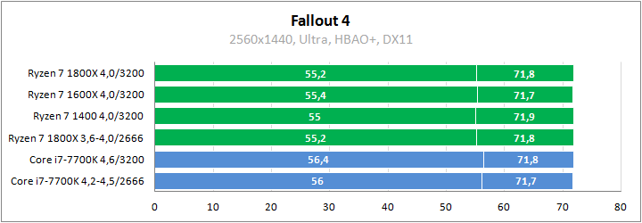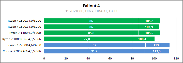 Ryzen 7 1800X проигрывает конкуренту в Fallout 4. И даже после разгона AMD слабее конкурента в номинале. Впрочем, с изначальным ограничением в 60 кадров вы эту разницу в игре не ощутите. Кэш и ядра не влияют на результаты Ryzen, важна лишь частота.