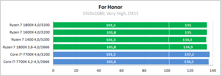 В игре For Honor мы видим идентичные результаты. Даже в режиме Full HD с частотой кадров на уровне 135–137 fps разница между AMD и Intel ничтожно мала. Так что тут любого процессора хватит с головой.