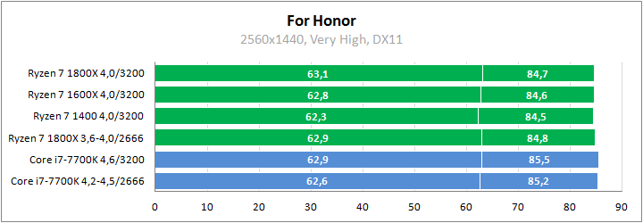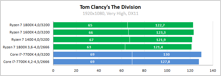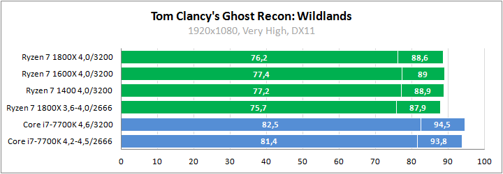 При настройках Very High заметно преимущество в несколько процентов у процессора Core i7-7700K. Примечательно, что разгон практически не влияет на результаты Intel и AMD, не меняя общий баланс.