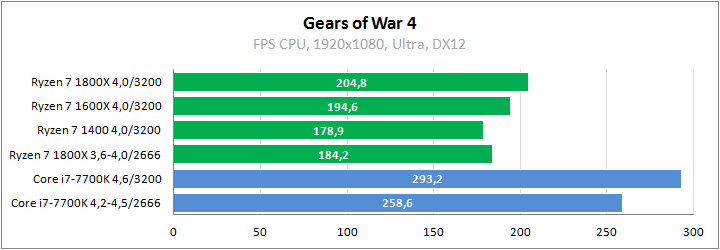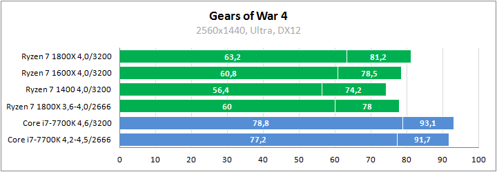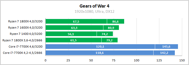 Результаты в бенчмарке Gears of War 4 выглядят весьма печально для AMD Ryzen 7 1800X — громадное отставание от Intel Core i7-7700K. Плюсом является тот факт, что с AMD вы все равно получите выше 60 fps.