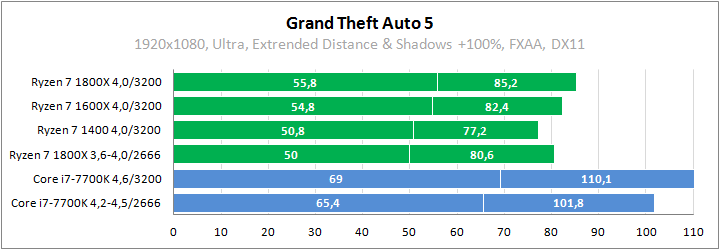 Можно сделать общие выводы и о потенциале AMD Ryzen 5 1600X. Отключение 2 ядер (4 потоков) совсем не принципиально для игровой производительности. Поэтому при одинаковых частотах AMD Ryzen 5 1600X и AMD Ryzen 7 1800X будут максимально близки. И это делает AMD Ryzen 7 1600X более выгодной покупкой для тех пользователей, чьи задачи ограничиваются игровой сферой. А вот наш аналог Ryzen 5 1400 оказался не просто слабее старших вариантов при одной частоте, но и слабее AMD Ryzen 7 1800X с более низкой номинальной частотой. Сказывается меньший объем кэш-памяти L3. Также нужно отметить, что реальные процессоры серии Ryzen 5 1400 работают в конфигурации 2+2 и начальные частоты у них весьма низкие. Так что без разгона производительность таких решений может быть заметно слабее. Но если удастся выжать 4 ГГц, то итоговая производительность будет близка к Ryzen 7 1800X в номинале.