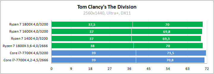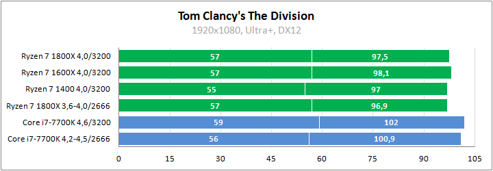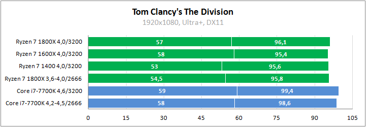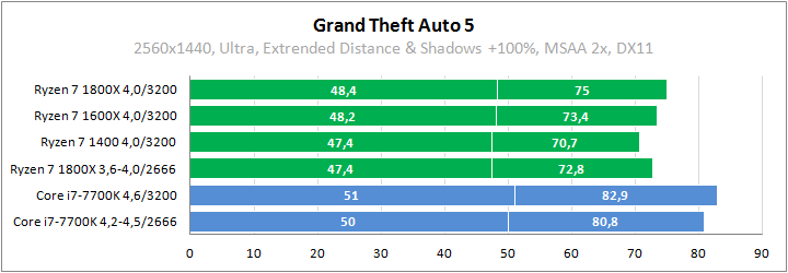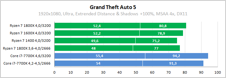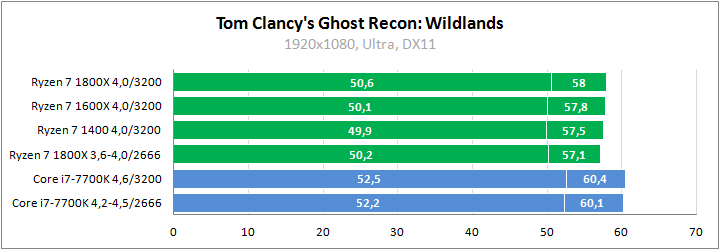 При повышении настроек графики до предела процессор Ryzen 7 1800X уже не является слабым звеном, хотя отставание в пару процентов сохраняется. Небольшое отставание теоретического процессора Ryzen 5 1400 может быть связано с вдвое меньшим объемом кэша L3.