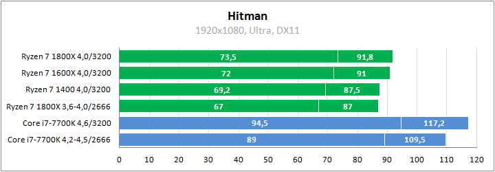 Повышение настроек графики снижает разрыв между Ryzen 7 1800X и Core i7-7700K, но второй сохраняет преимущество. Самые низкие результаты у аналога разогнанного Ryzen 5 1400.