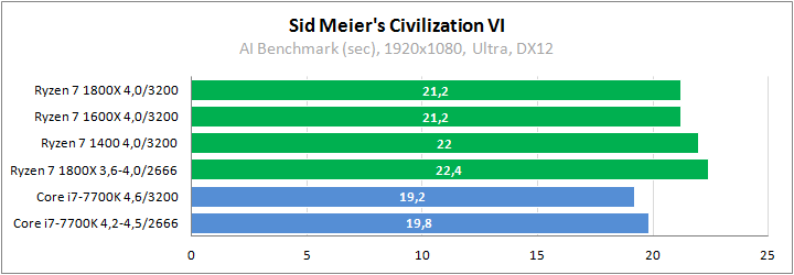 Бенчмарк ИИ не зависит от графических параметров, и время хода противника в Civilization одинаково в обоих разрешениях. Процессор Intel Core i7-7700K с этой задачей справляется быстрее, что обеспечит меньший период ожидания при ходе компьютерного противника на карте. Никакой разницы между Ryzen с 6 и 8 ядрами. А вот аналог ускоренного Ryzen 5 1400 почти не отличается от Ryzen 7 1800X в номинале.