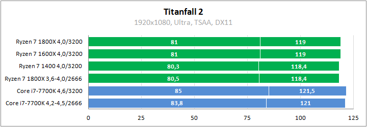 В Titanfall 2 можно констатировать примерное равенство конкурентов. Конечно, заметна общая тенденция с преимуществом Core i7-7700K, но даже при средней частоте кадров под 120 fps эта разница столь незначительная, что не играет никакой роли.