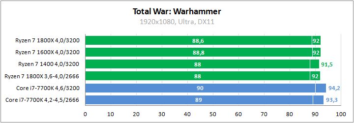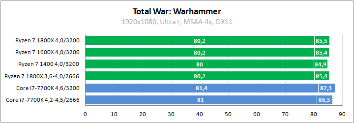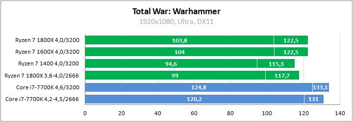Стоит отметить интересную тенденцию с хорошим ростом производительности при переходе от DirectX 11 к DirectX 12 в Hitman. Возможно, новый API лучше раскрывает потенциал AMD Ryzen. С другой стороны, есть крайне печальные для AMD результаты в Gears of War 4, где наблюдается серьезный отрыв Core i7-7700K в том же DirectX 12. Среди слабых результатов можно отметить и отставание в GTA 5. В принципе, AMD Ryzen 7 позволяет вполне комфортно играть в тот же Grand Theft Auto, но на Core i7-7700K частота кадров будет явно лучше. Важную роль играет оптимизация. AMD Ryzen — это свежий продукт на новой архитектуре, и за счет программных оптимизаций его результаты могут еще немного вырасти. В качестве примера стоит упомянуть стратегию Total War: Warhammer — на днях было объявлено о специальном обновлении, улучшающем производительность на AMD Ryzen вплоть до 10%. Не стоит ожидать, что все игровые разработчики бросятся оптимизировать игры под особенности AMD Ryzen, но какие-то обновления для крупных проектов могут выйти. И в будущем поддержка AMD Ryzen будет улучшаться.