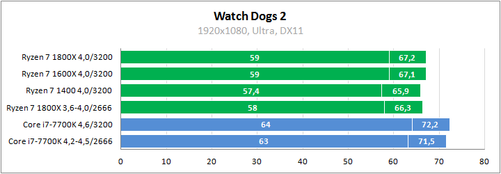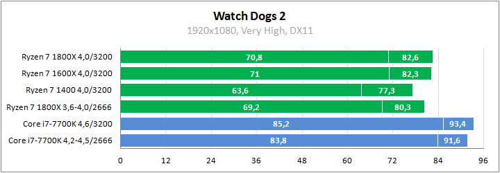 Согласно средствам мониторинга Watch Dogs 2 отлично запружает все 16 потоков более чем на 70%. Но Ryzen 7 1800X все равно проигрывает конкуренту. Core i7-7700K со своими 8 потоками при высокой частоте оказывается более эффективным, обеспечивая выигрыш 14–19% в тестовой сцене.