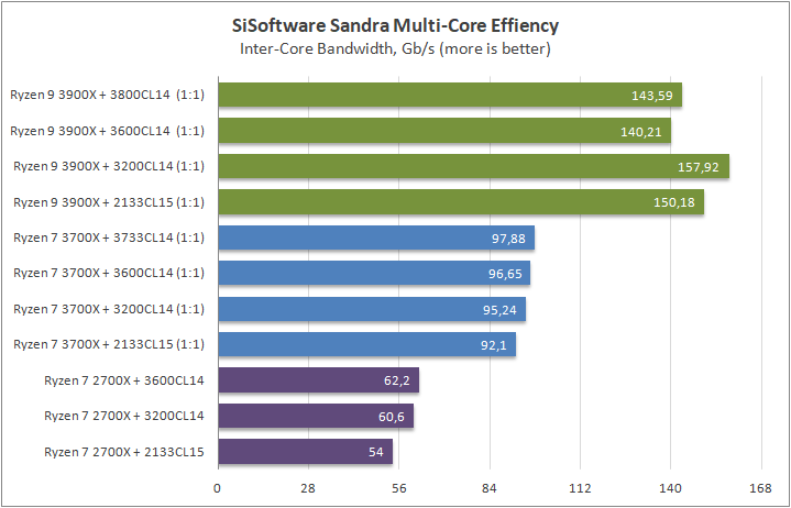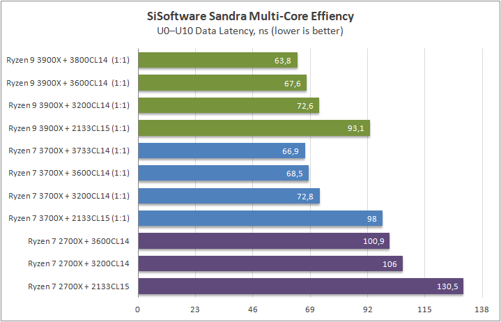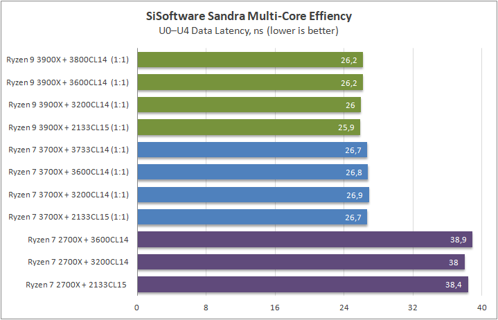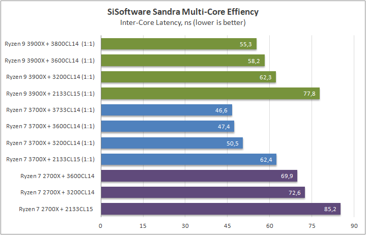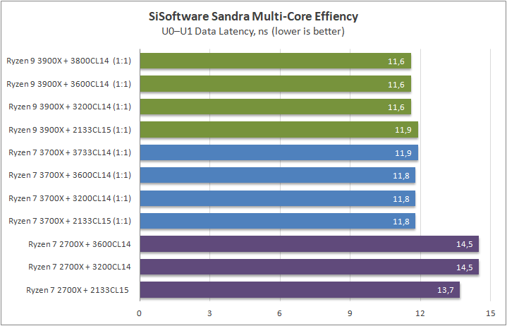 Полноценная шина Infinity Fabric (2х16 такт на запись) позволила отыграть у Ryzen 7 3700Х 5% производительности в задачах, где присутствует высокоинтенсивная запись или копирование. Но опять же, это синтетика и в большинстве приложений разница будет отсутствовать.