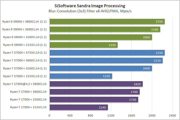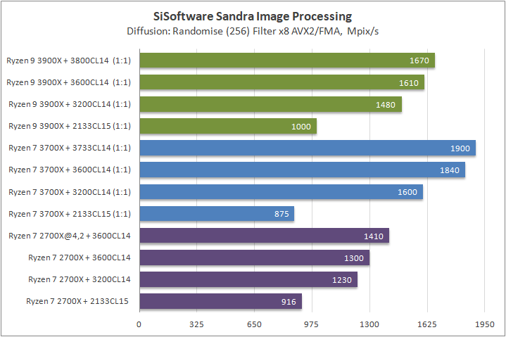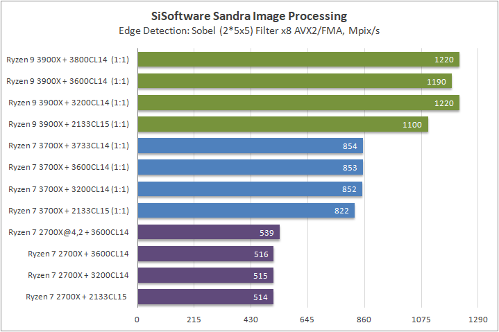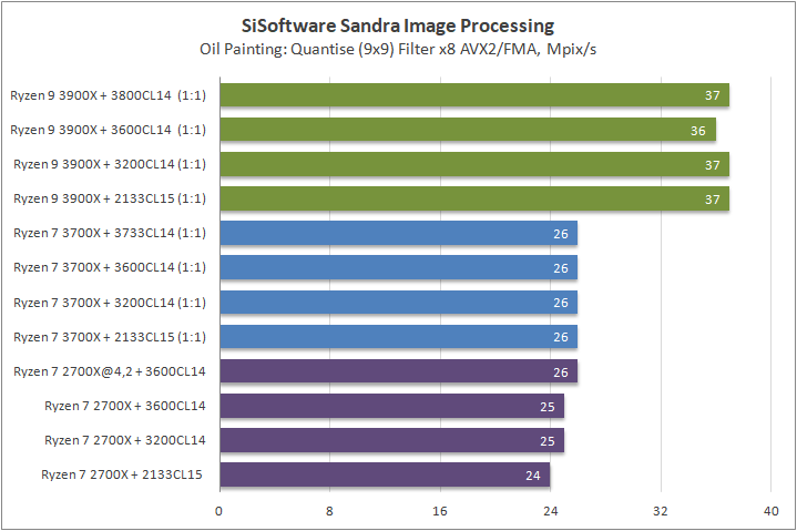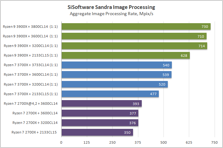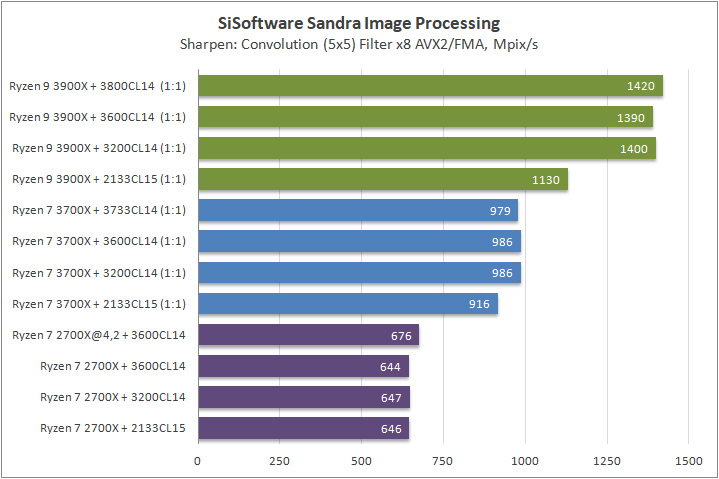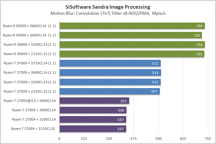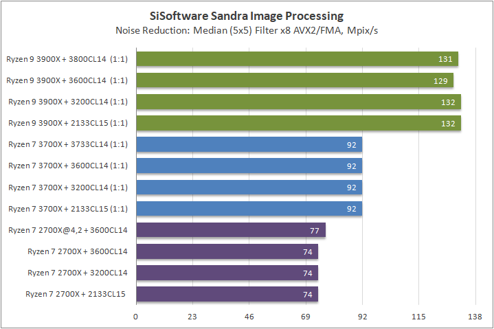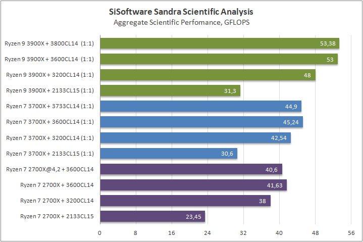 Данный тестовый пакет довольно чувствителен к пропускной способности оперативной памяти, что собственно можно заметить по результатам. Ryzen 9 3900Х опередил Ryzen 7 3700Х на величину 17% и на 82% флагмана поколения Zen+.