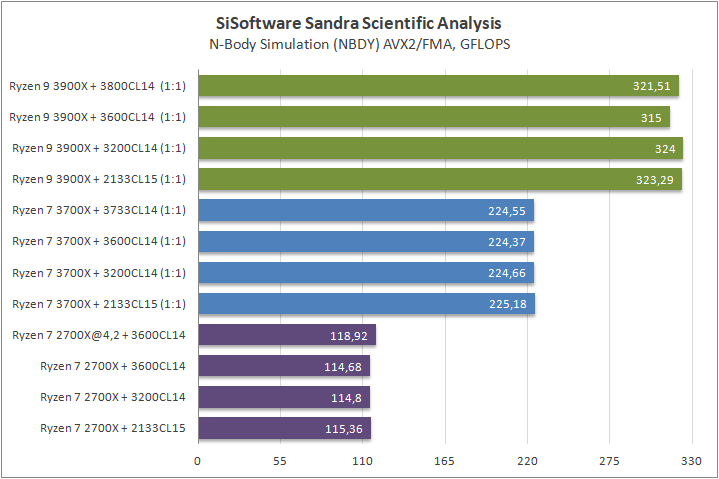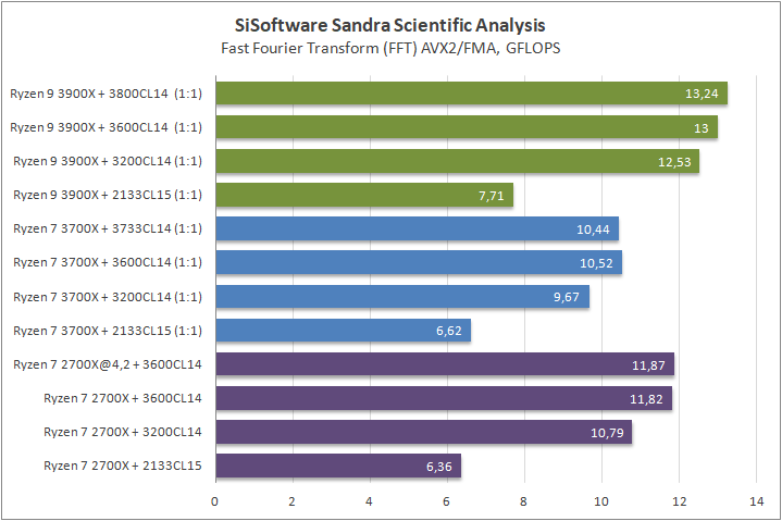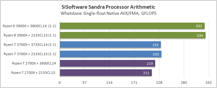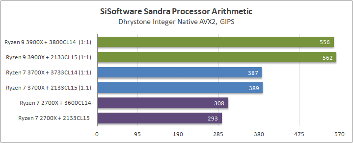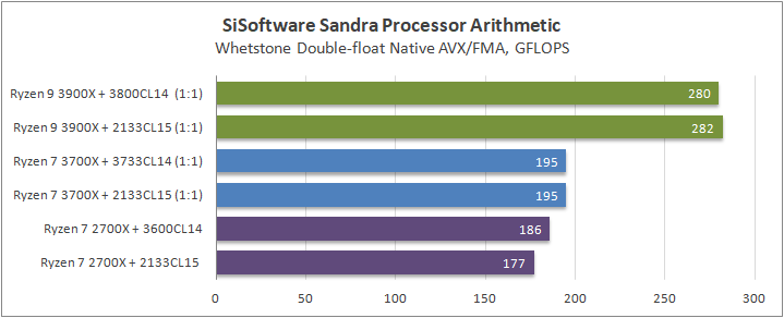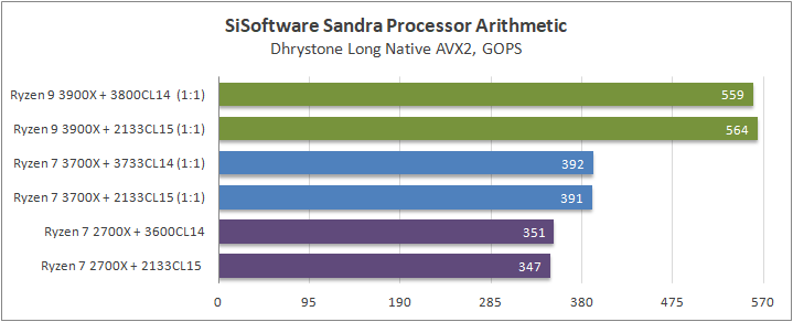 Безоговорочное превосходство над Ryzen 7 3700Х и Ryzen 7 2700Х. Максимальная разница может достигать 35–44%, если сравнивать Ryzen 7 3700Х и Ryzen 9 3900Х, и до 220%, если сравнивать с Ryzen 7 2700Х. Тем не менее, как показали тесты, присутствует программная блокировка арифметической производительности в случае с Ryzen 9 3900X и, в теории, процессор может продемонстрировать куда лучшие результаты. Также хочу напомнить, эта серия тестов очень чувствительна к пропускной способности IF, которая с разгоном упала, что отразилось на результатах.
