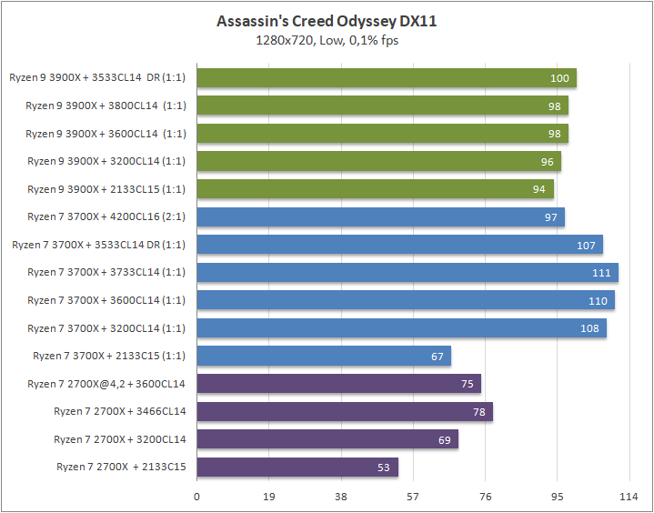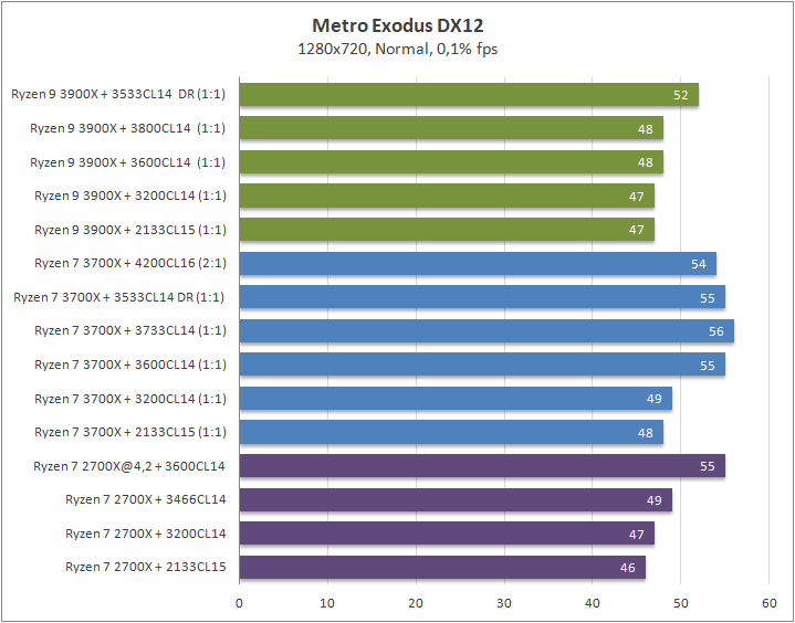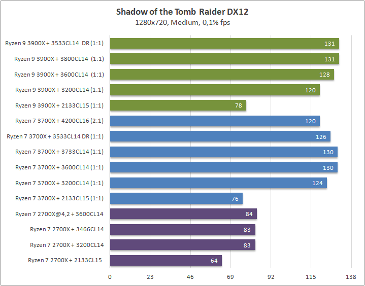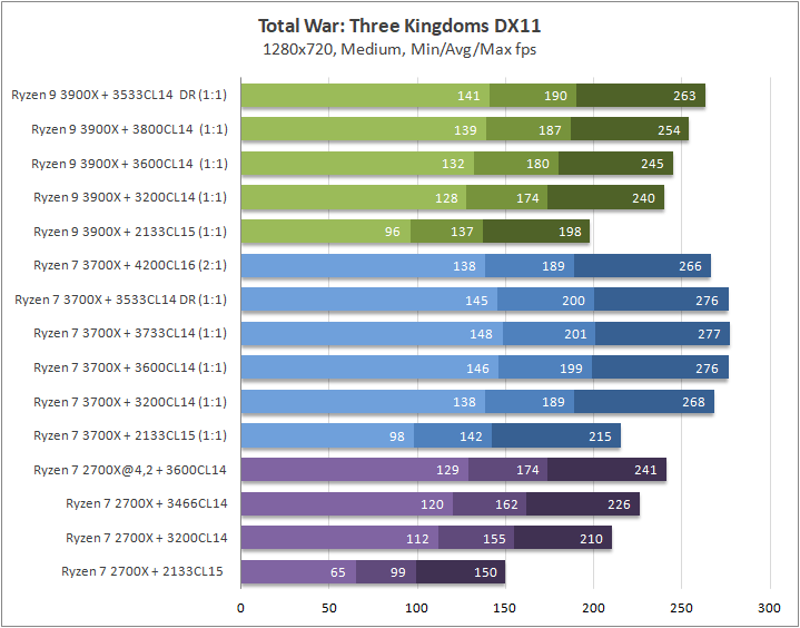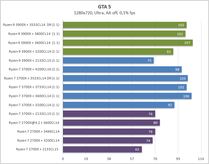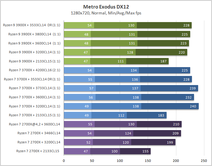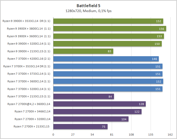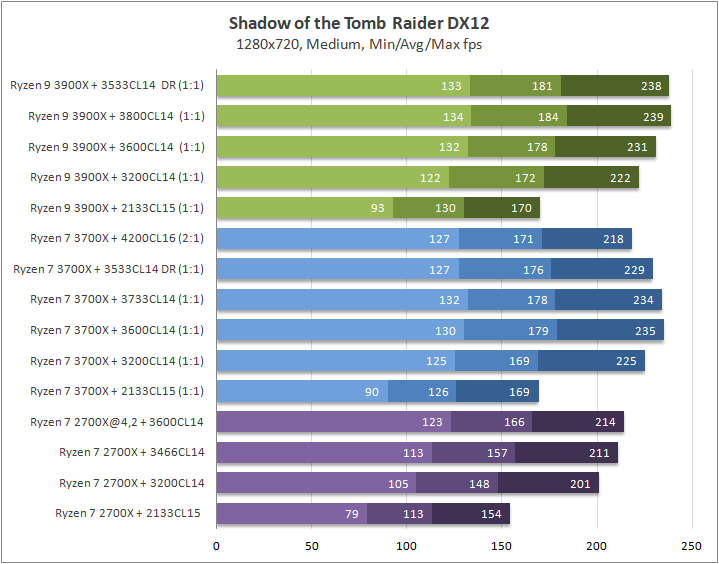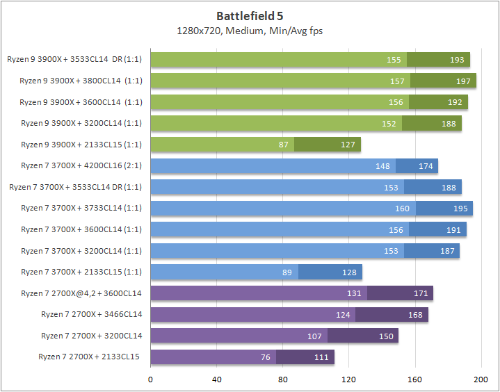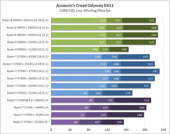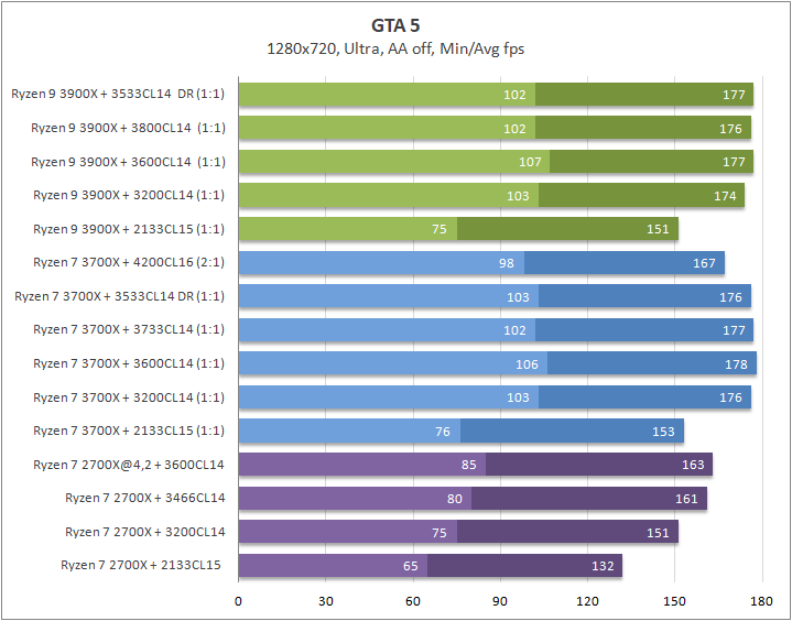 Исходя из всего вышеописанного, для тестирования процессорного fps было выбрано 720р со средними или низкими настройками. Настройки были именно такие, дабы сделать процессор слабым по отношению к видеокарте и увидеть именно его результат, а не результат видеокарты. Возможно, вы скажите, что это синтетика и зачем она нужна, ведь в таком разрешении никто не играет. Да, верно, не играет, но когда заходит речь, чтобы пересесть с GeForce GTX 970 на Radeon RX 5800 XT или GeForce RTX 2080 Ti все кидаются на форумы с вопросом о раскрытии «потанцевала». Именно для этих людей, которые по каким-либо причинам не вникают в суть вопроса, существует данная синтетика. Она продемонстрирует возможности процессора, и вы будете уверены в том, что когда поставите три штуки GeForce RTX 2080 Ti, у вас будет именно та производительность, которую показал я вам в обзоре.