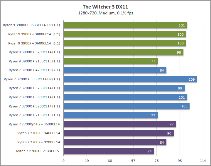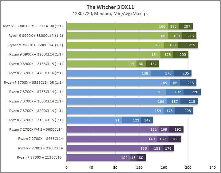 В прошлом материале я говорил о том, что пропускная способность на запись в оперативную память в случае одночиплетного процессора составляет только 16 байт за такт и максимум, который удавалось получить, был равен около 29 ГБ/с. Ryzen 9 3900Х же является более полноценным и суммарная пропускная способность оперативной памяти на запись составляет 2x16 байт за такт. Далее на скриншоте теста AIDA мы можем увидеть, что с записью теперь все хорошо — 57 ГБ/с. Что это нам дало? Почти 5% производительности в задачах, где соотношение запись/чтение составляет не 1:2, а 1:1. Данный нюанс довольно сложно проверить, но, благо, тестовый пакет MEMbench выручил. Если, к примеру, сравнить идентичные пресеты 3200С14 на Ryzen 7 3700Х и Ryzen 9 3900Х в тесте Easy, мы получим 124 и 118 секунд, то есть те самые 5%. Больше результатов будет приведено в разделе тестов.