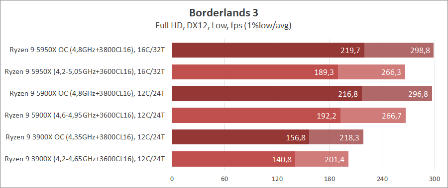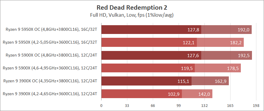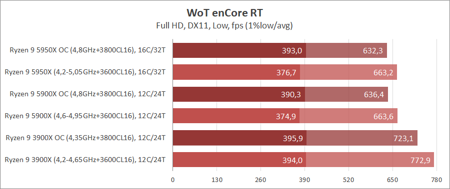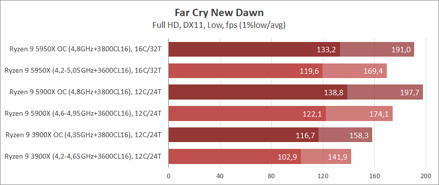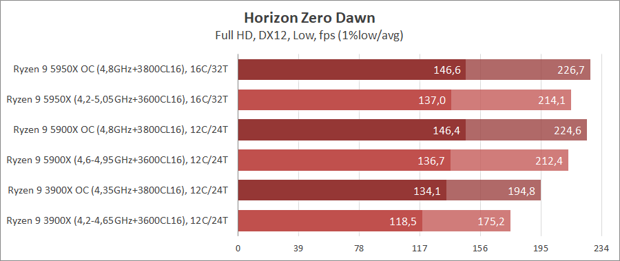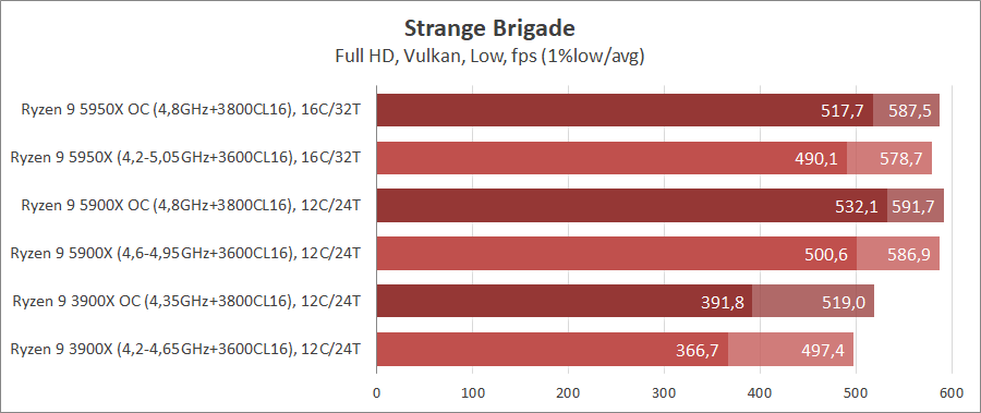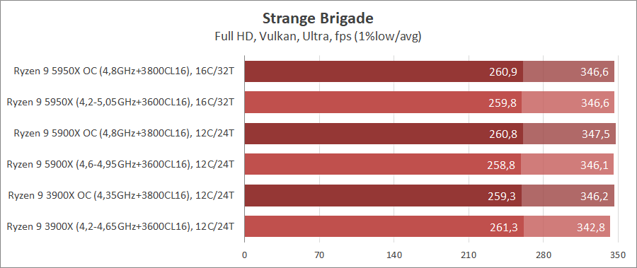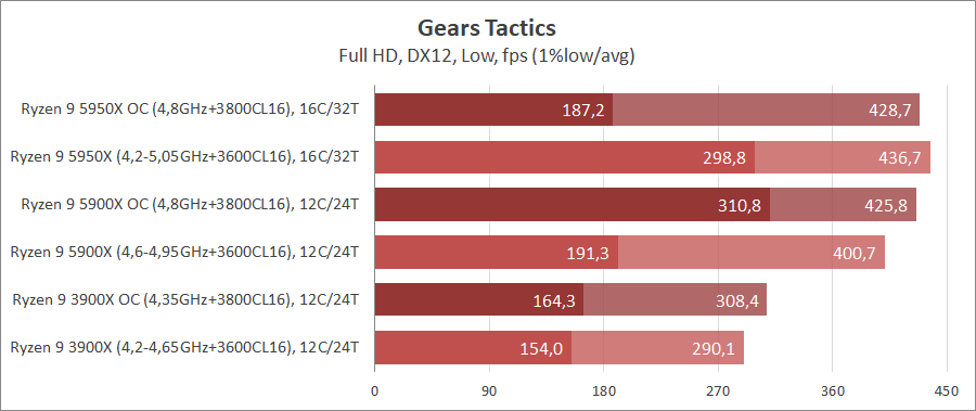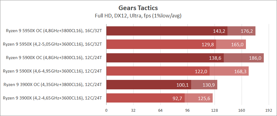 Тактическая игра во вселенной Gears of War отличается не очень приятной особенностью, которая заключается в новой сцене при каждом запуске бенчмарка, а она, к тому же, по-разному прогружается и некоторым процессорам в этом плане не повезло — четыре повтора дали сильную просадку по 1% low у «младшего» Vermeer в номинале и при разгоне у Ryzen 9 5950X. Если судить по среднему количеству кадров, то новинки в недосягаемости даже при ультра-качестве графики.